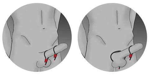 - ElectraStim Prestige ElectraLoops se puede usar en una variedad de maneras diferentes. Dos de las configuraciones más populares se muestran a continuación; ambos bucles usados en el eje o uno en el eje y uno alrededor del escroto.